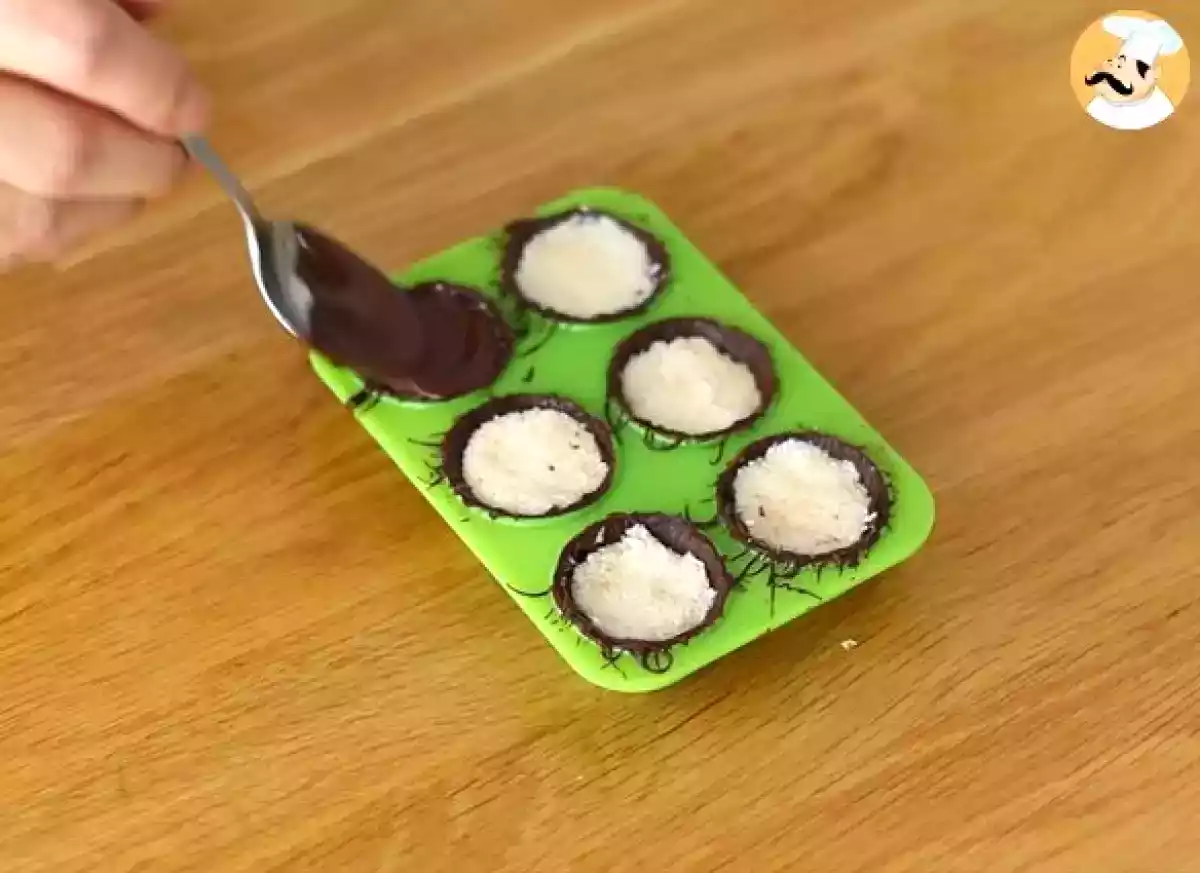 Pour finaliser le tout, verser un peu de chocolat fondu dans chaque empreinte par-dessus la noix de coco afin de refermer les bouchées Bounty.