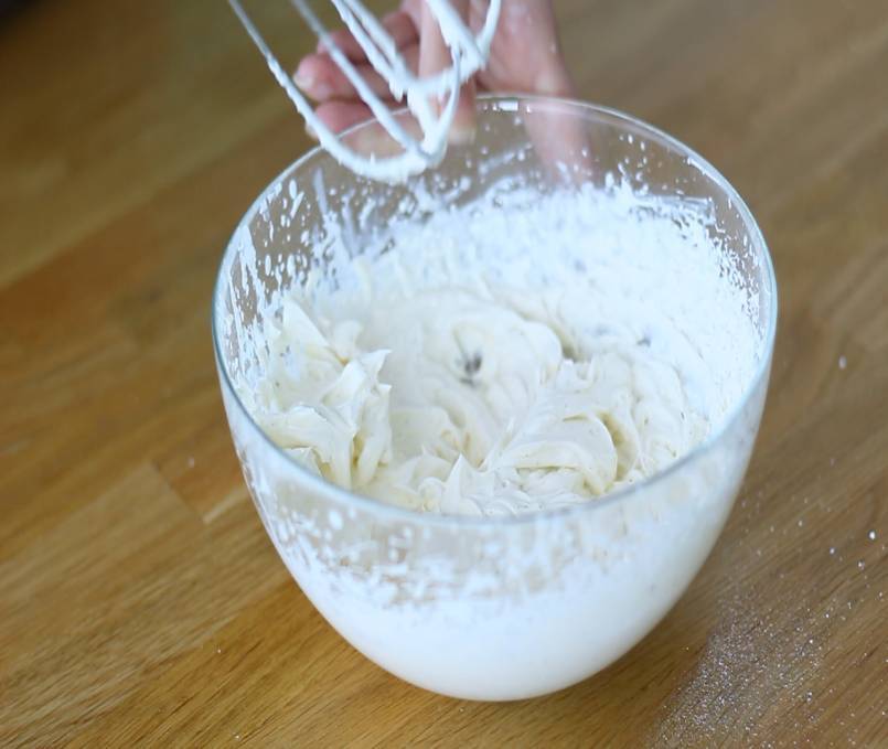 Mettre le mascarpone, la crème bien froide, le sucre glace et les graines de la gousse de vanille dans un bol bien froid et fouetter à pleine vitesse pour monter la chantilly.