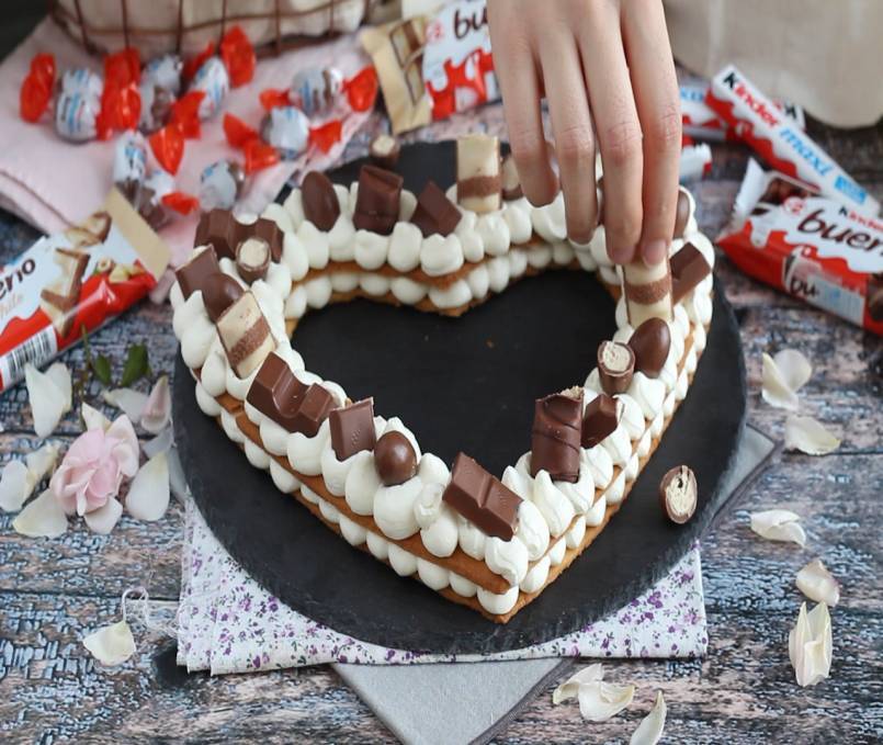 La Saint-Valentin approche à grands pas et si vous voulez faire plus qu'offrir des fleurs ou des chocolats, ce gâteau en forme de cœur fait maison est la solution. Nous prendrons une pâte sablée (maison ou achetée) et la découperons en forme de cœur, nous la remplirons d'une crème de mascarpone soyeuse aromatisée à la vanille et nous finirons par la décorer de chocolats Kinder pour la rendre plus belle.
