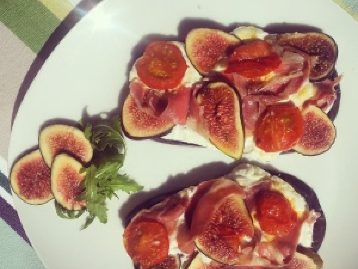 Tartine d’aubergine, figues, ricotta et jambon de parme