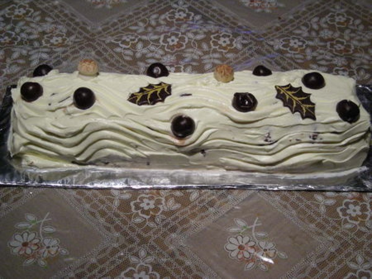 Buche biscuit chocolat sur croustillant, ganache montee ivoire, cerises kirsch