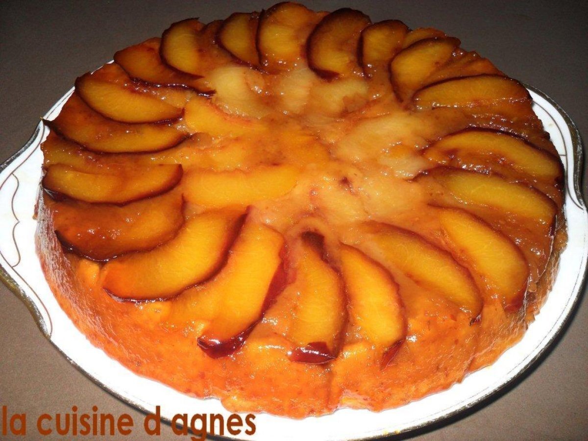 un gâteau "façon tatin" aux pêches ou nectarines (fruits de saison).. au bon goût d'amande.. c'est renversant !