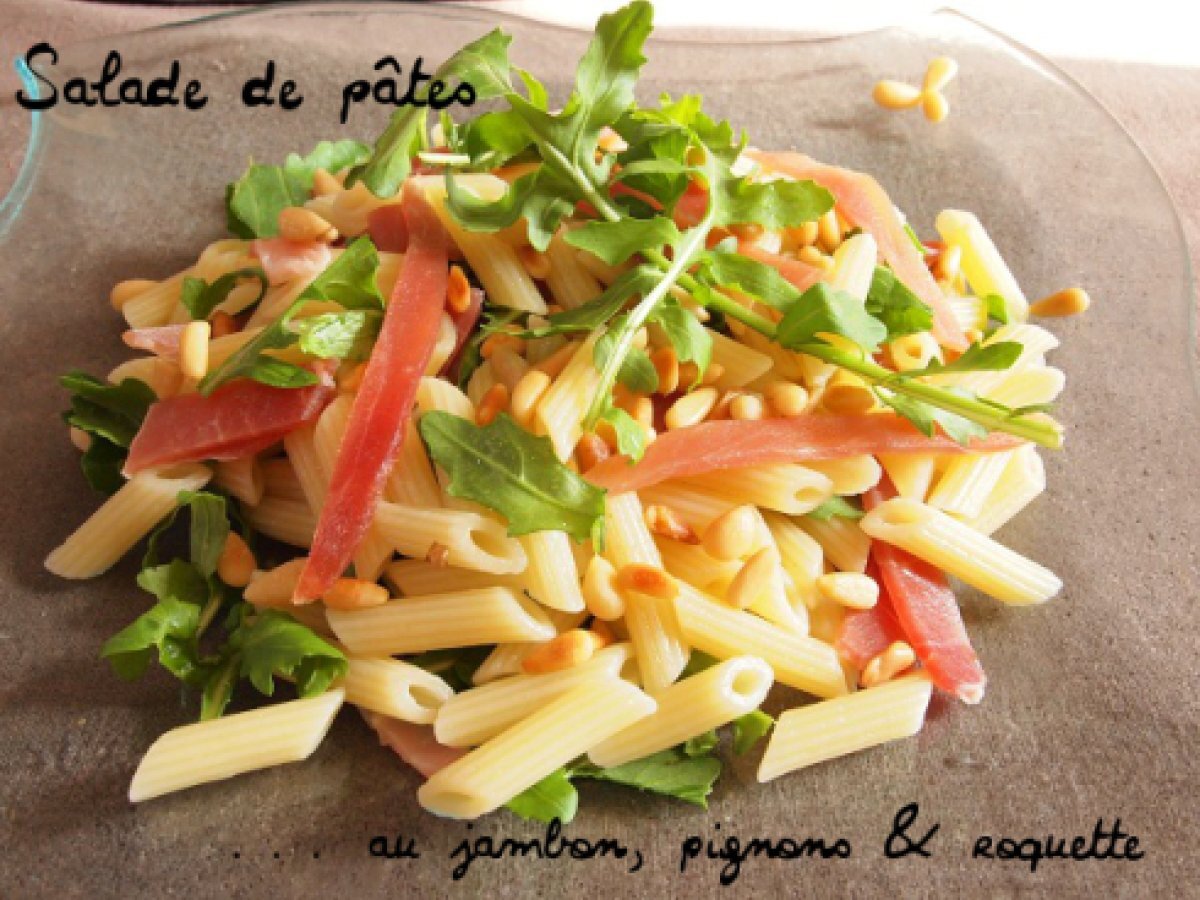 Salade de pâtes au jambon, pignons et roquette.