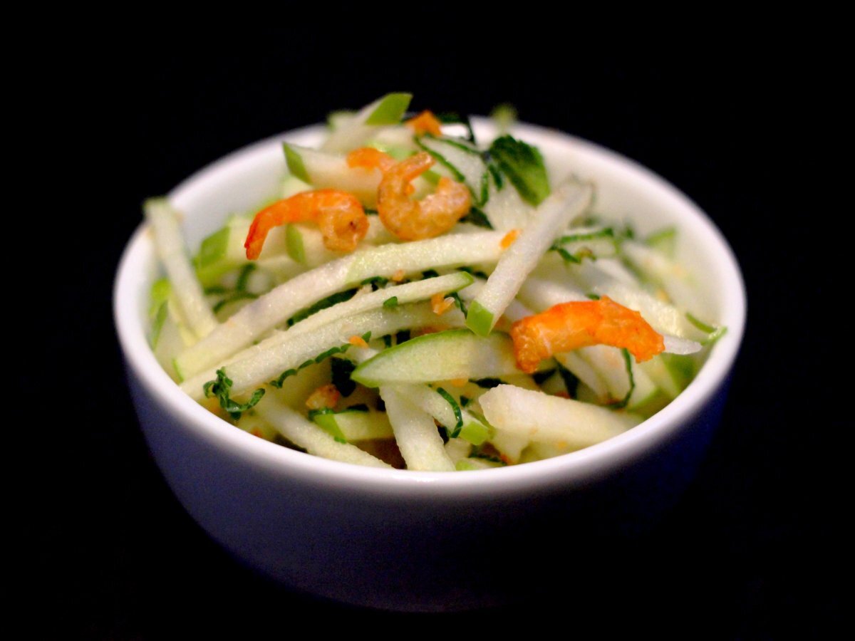 Ça faisait longtemps que je ne m'étais pas autant enthousiasmé pour une petite recette. AD-DIC-TIF ! Aujourd'hui ça sera donc Salade Granny Smith/ Menthe / Crevettes séchées