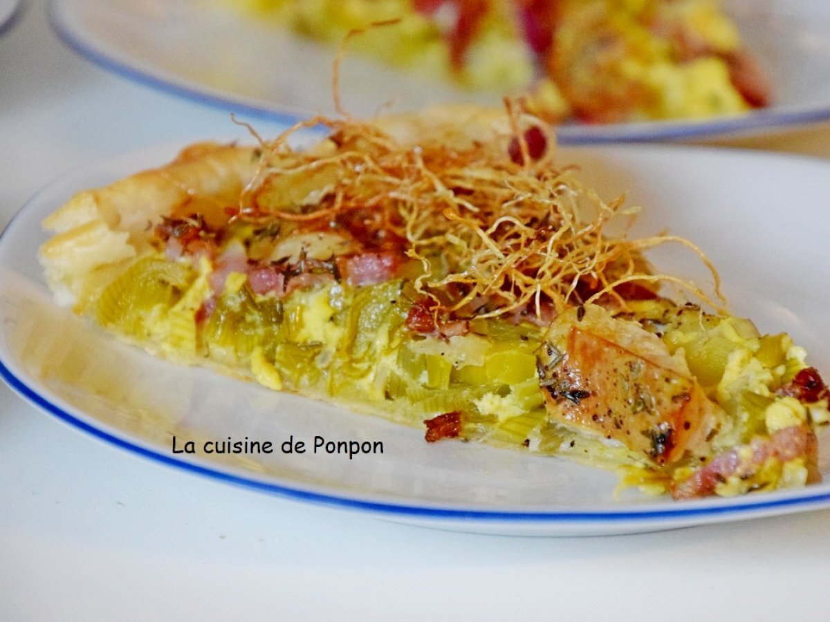 Voici une tarte bien sympathique avec le fondant et le croquant du poireau: le fondant du blanc de poireau précuit à la poêle et le croquant de la racine du poireau rissolée dans la friture!