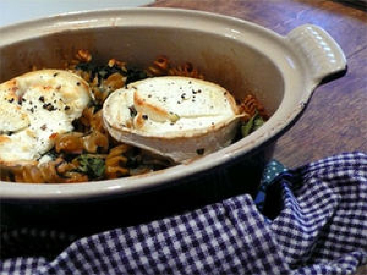 Gratin de fusilli aux épinards frais et fromage de chèvre