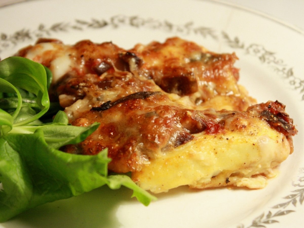 Quenelles avec une sauce aux aubergines, aux tomates et à la sauge, gratinées au four avec de la mozzarella et du parmesan.