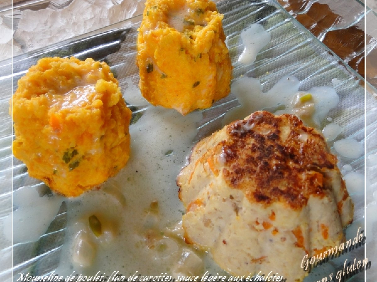 Mousseline de poulet, flan de carottes, sauce légère aux échalotes