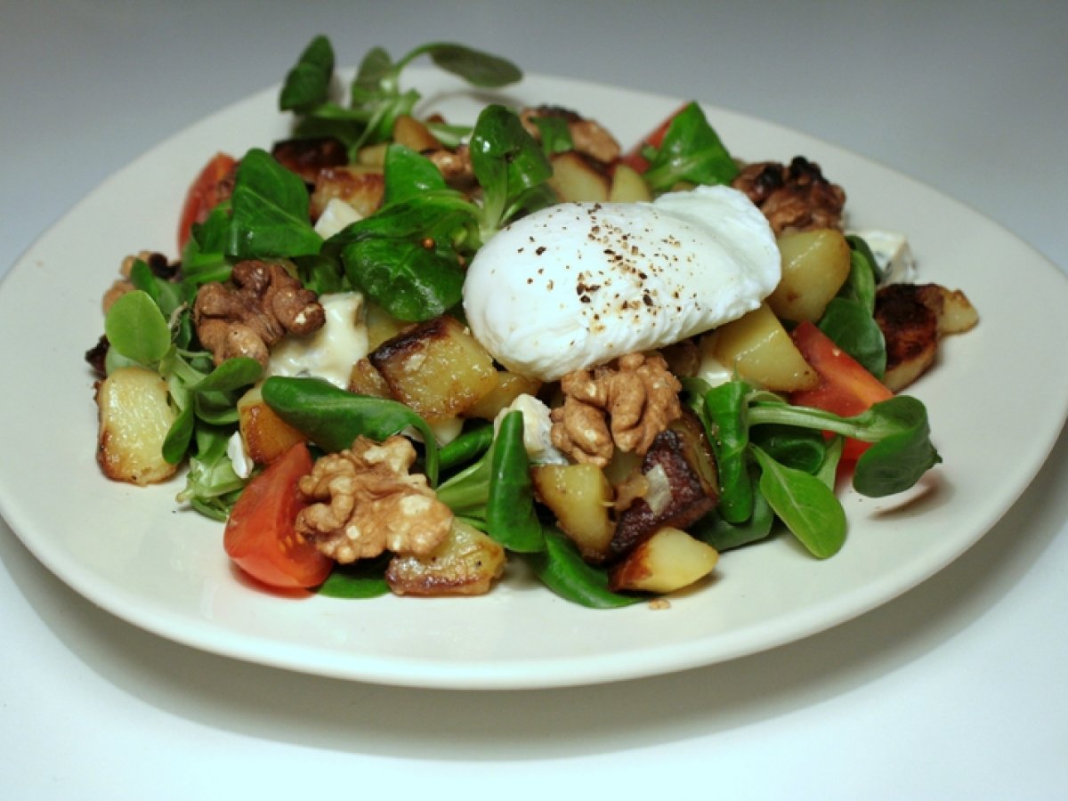 Salade de mâche aux pommes de terre, bleu, noix & oeuf poché