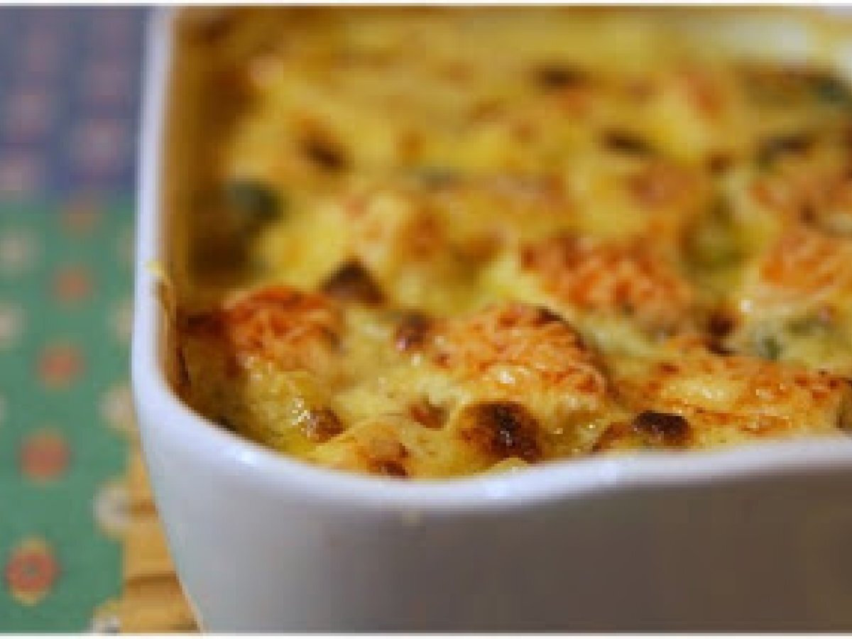 Ce plat se compose de pavés de saumon coupés en dés, assaisonnés au jus de citron, puis disposés sur un lit de petits légumes (carottes et courgettes) revenus à l'huile d'olive et nappés d'une sauce béchamel onctueuse. Le tout est gratiné au four avec une couche d'emmental râpé pour une finition dorée et savoureuse. La texture combine la tendreté du saumon et le fondant des légumes, relevés par le goût délicat du fromage gratiné, idéal à déguster avec du pain de seigle grillé.