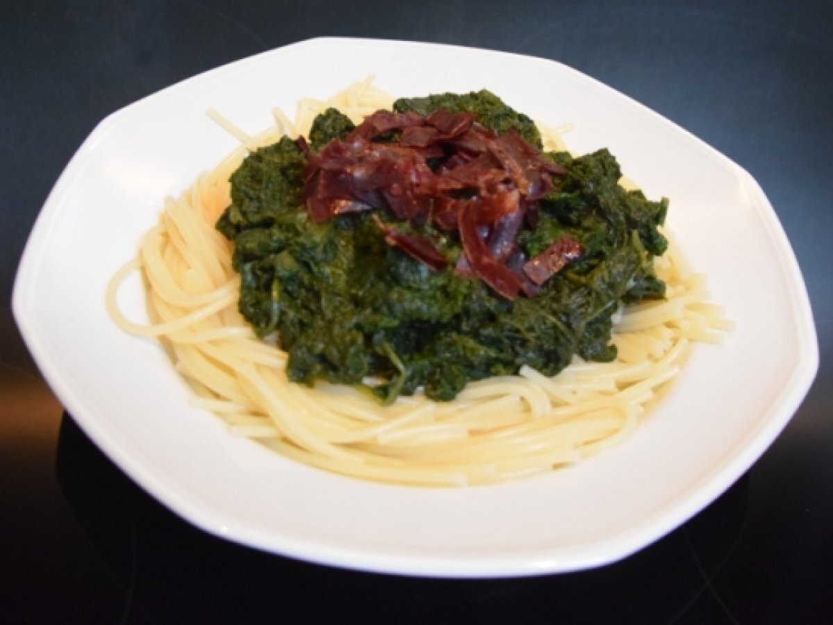 Spaghettis aux épinards et aux lardons des grisons (ig bas)