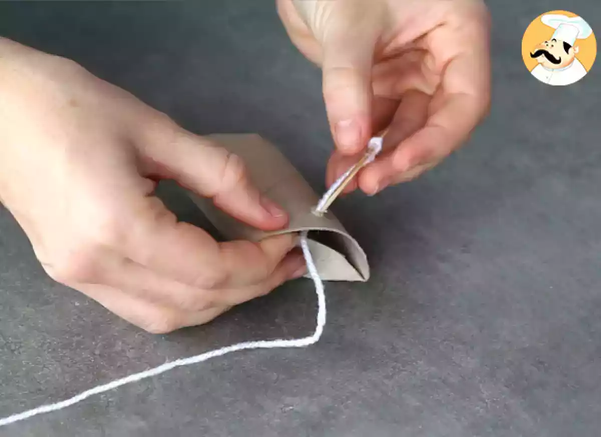 Couper un morceau de fil (ici en laine) et le passer dans le trou (pour faciliter cette étape, l’enrouler autour d’un pique en bois type cure dent et le piquer à l’intérieur). Pensez à couper des fils de plusieurs longueurs afin que les boîtes ne soient pas toutes au même niveau à la fin.