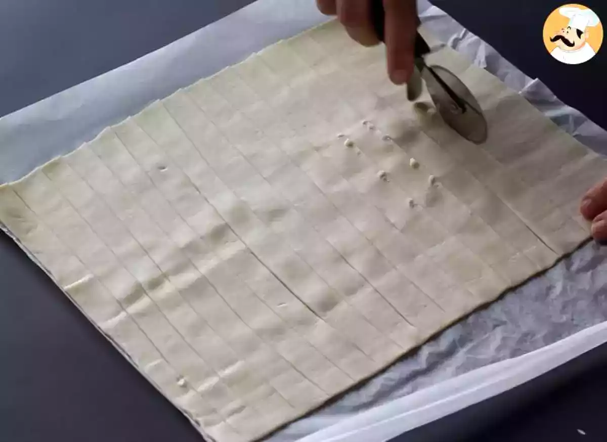 Etalez votre pâte feuilletée sur une surface plane et découpez des bandes d'environ 1 cm de large. Ici, nous avons pu en découper 16.