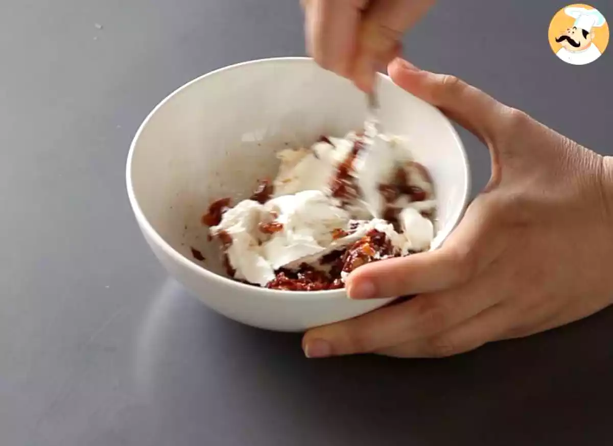 Pendant la cuisson, préparez la farce qui viendra se glisser dans vos carottes feuilletées. Pour cela et dans un bol, mélangez le fromage frais avec les tomates séchées coupées en petits morceaux.