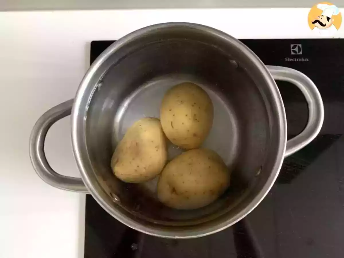 Pour commencer, c’est tout simple! Il faut faire cuire les pommes de terre dans une bonne quantité d’eau bouillante salée pendant 20 minutes, jusqu’à ce qu’elles soient bien tendres. Pour vérifier la cuisson, piquer les avec un couteau. Si celui-ci s’enfonce sans effort dans la pomme de terre, c’est que c’est cuit!