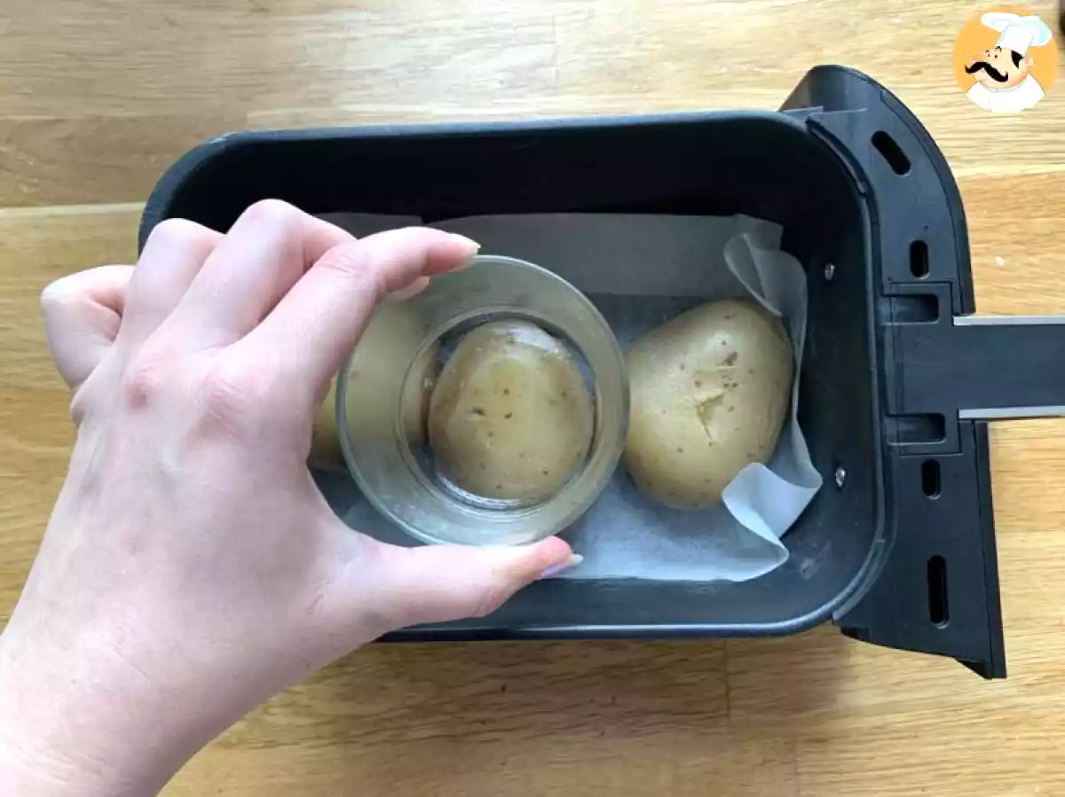Déposer du papier cuisson au fond du bac de votre Air fryer, puis disposez dessus vos pommes de terre. Ensuite, munissez-vous d’un verre, et écrasez vos pommes de terre.