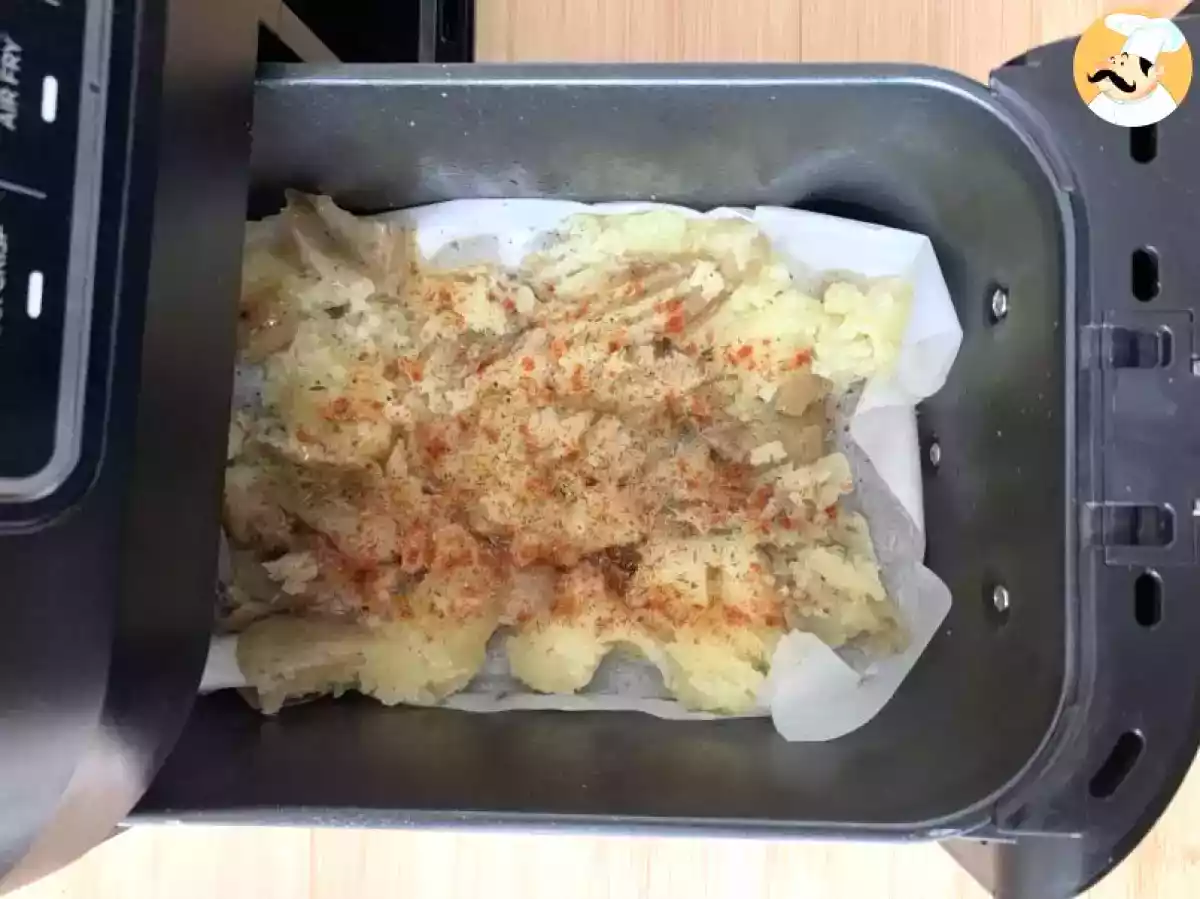 Sur vos pommes de terre écrasées, ajoutez un filet d'huile d'olive, du sel, du poivre, du paprika et du thym. Mais vous pouvez utiliser les épices de votre choix! Choisissez le mode “airfry”, et faites cuire pendant 20 minutes à 180°. N’oubliez pas de retourner vos pommes de terre à mi-cuisson.