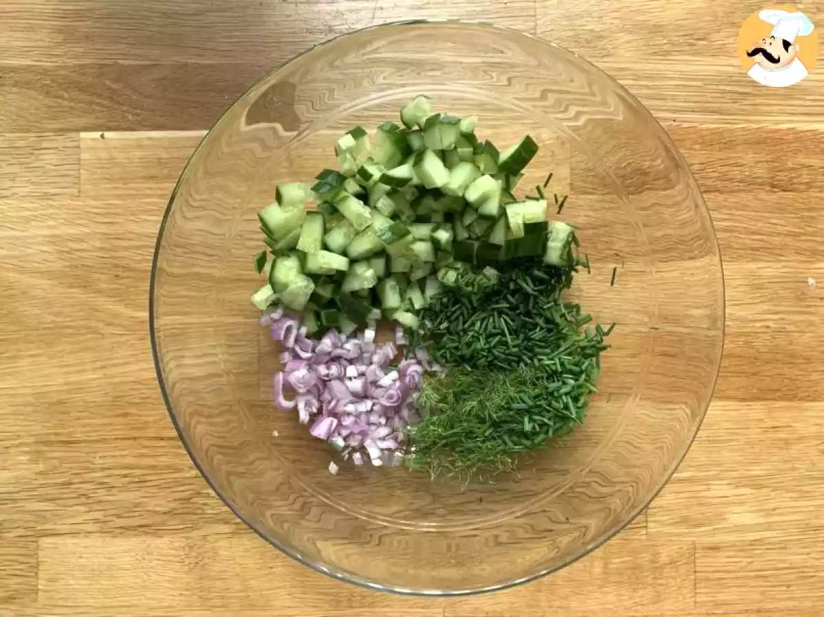 Pendant que vos pommes de terre cuisent, vous pouvez commencer à préparer la salade de concombre. Il suffit de couper finement l'échalote, la ciboulette, l'aneth ainsi que le concombre et de mettre le tout dans un saladier.