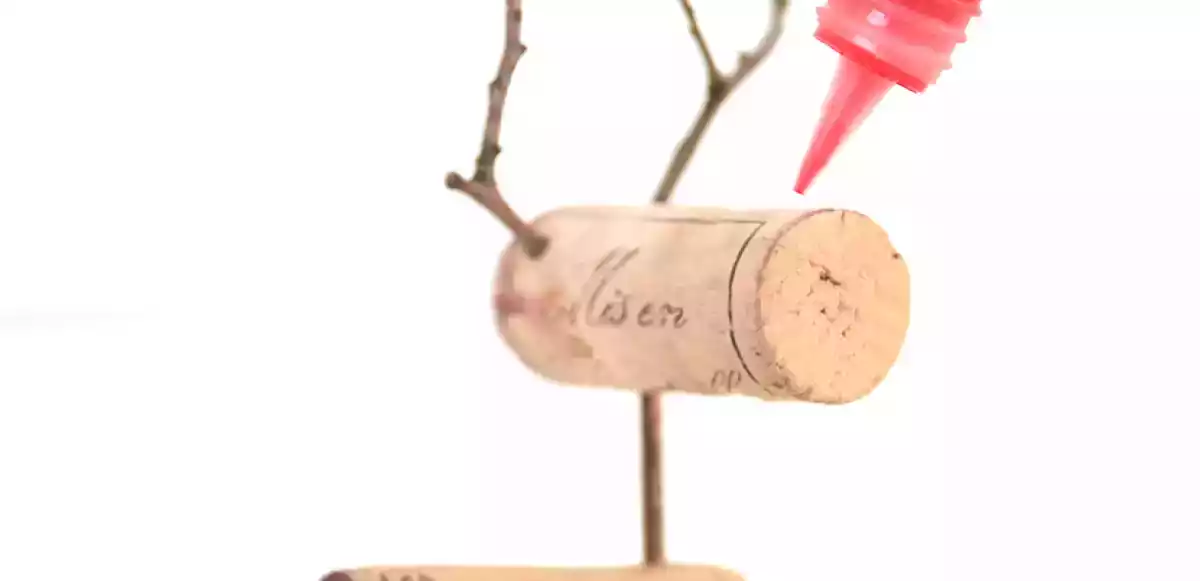 ► Formez la truffe en mettant un point de colle rouge à l'autre extrémité du bouchon formant la tête du renne (ou en y collant un petit pompon rouge, etc).