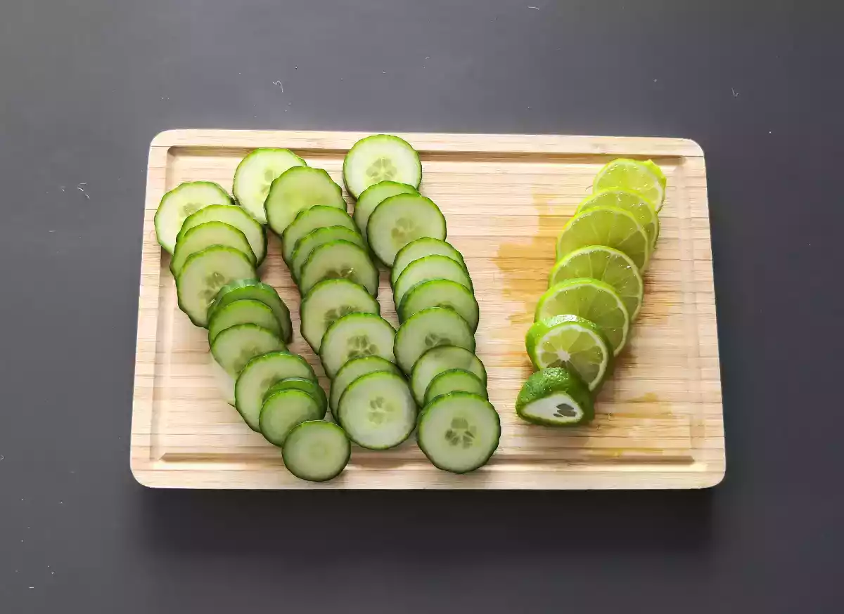 Laver soigneusement le concombre et le citron vert sous l'eau et les couper en rondelles.