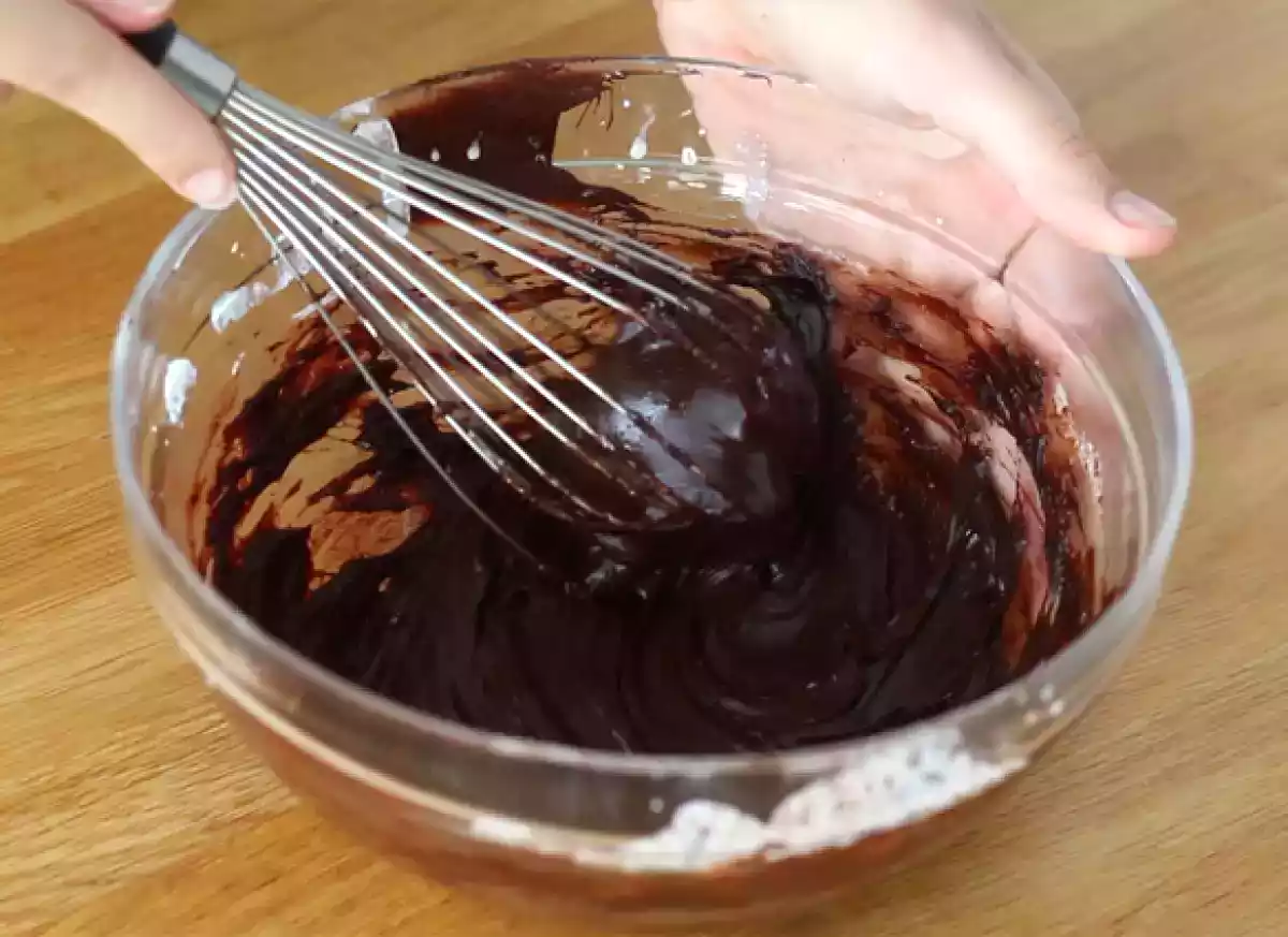 - Faire bouillir la crème. Verser la crème sur le chocolat et bien mélanger au fouet pour incorporer.