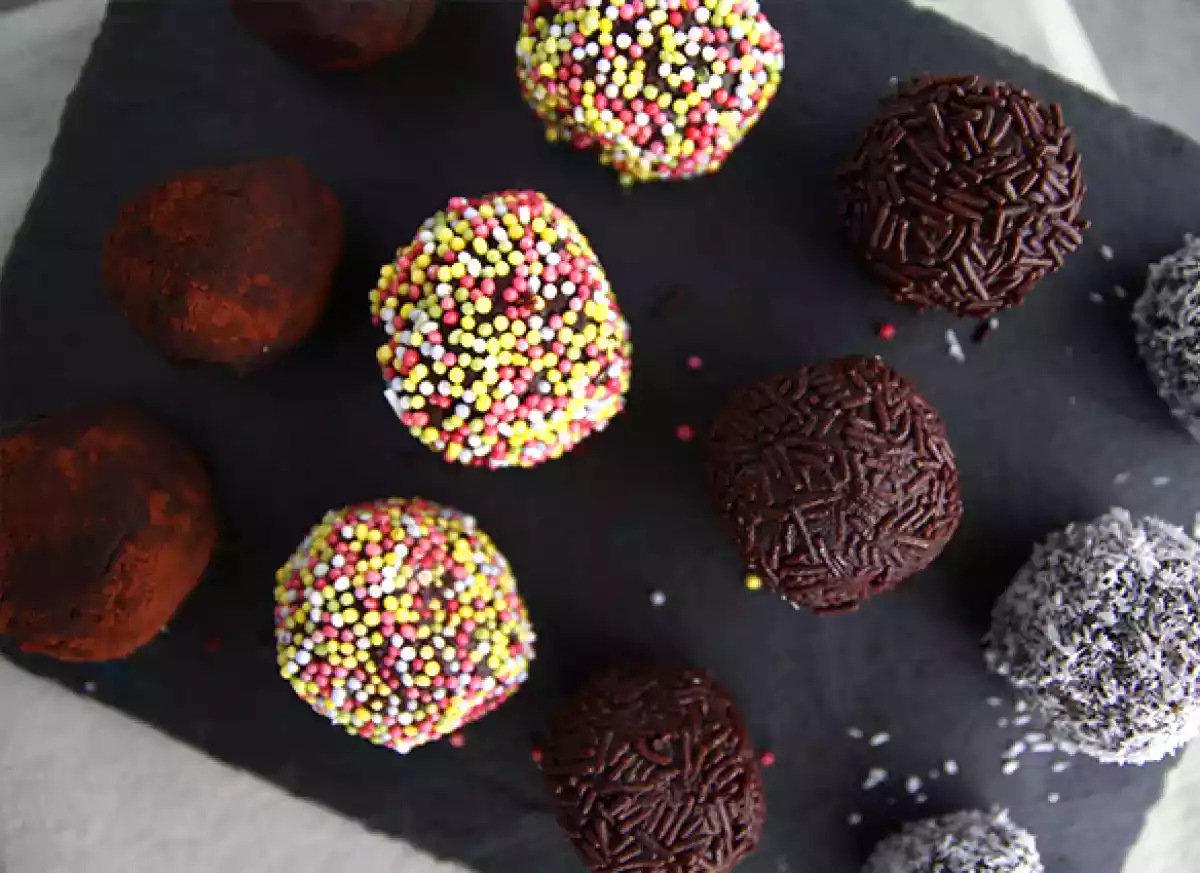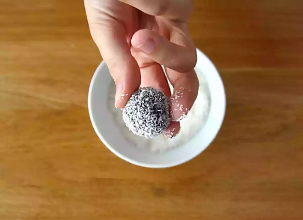 - Rouler les boules dans la noix de coco râpée, le cacao amer en poudre, les vermicelles de chocolat ou les perles de sucre colorées.