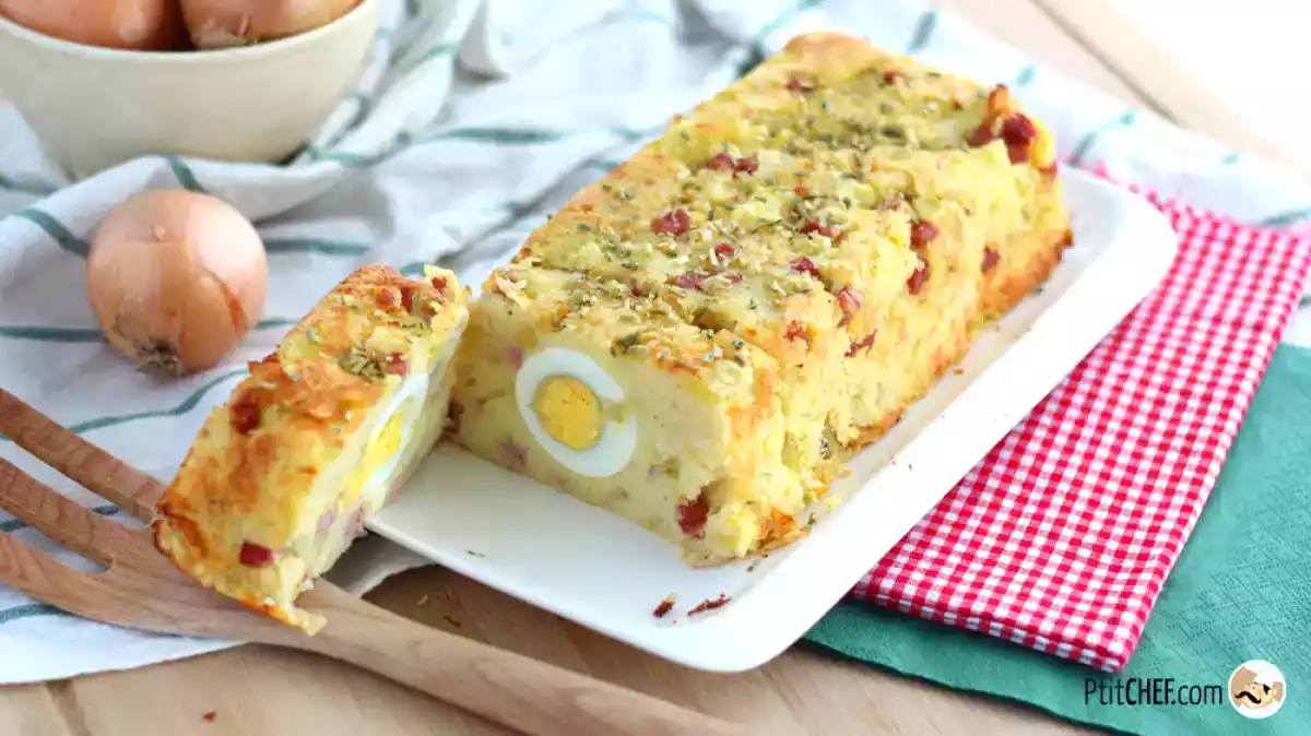 Que nenni! Car on vous le rappelle: les choses simples sont souvent les meilleures ;-) On va donc faire cuire nos pommes de terre coupées en rondelles dans une casserole d'eau chaude, les écraser, les mélanger aux autres ingrédients et placer le tout... dans un moule à cake!