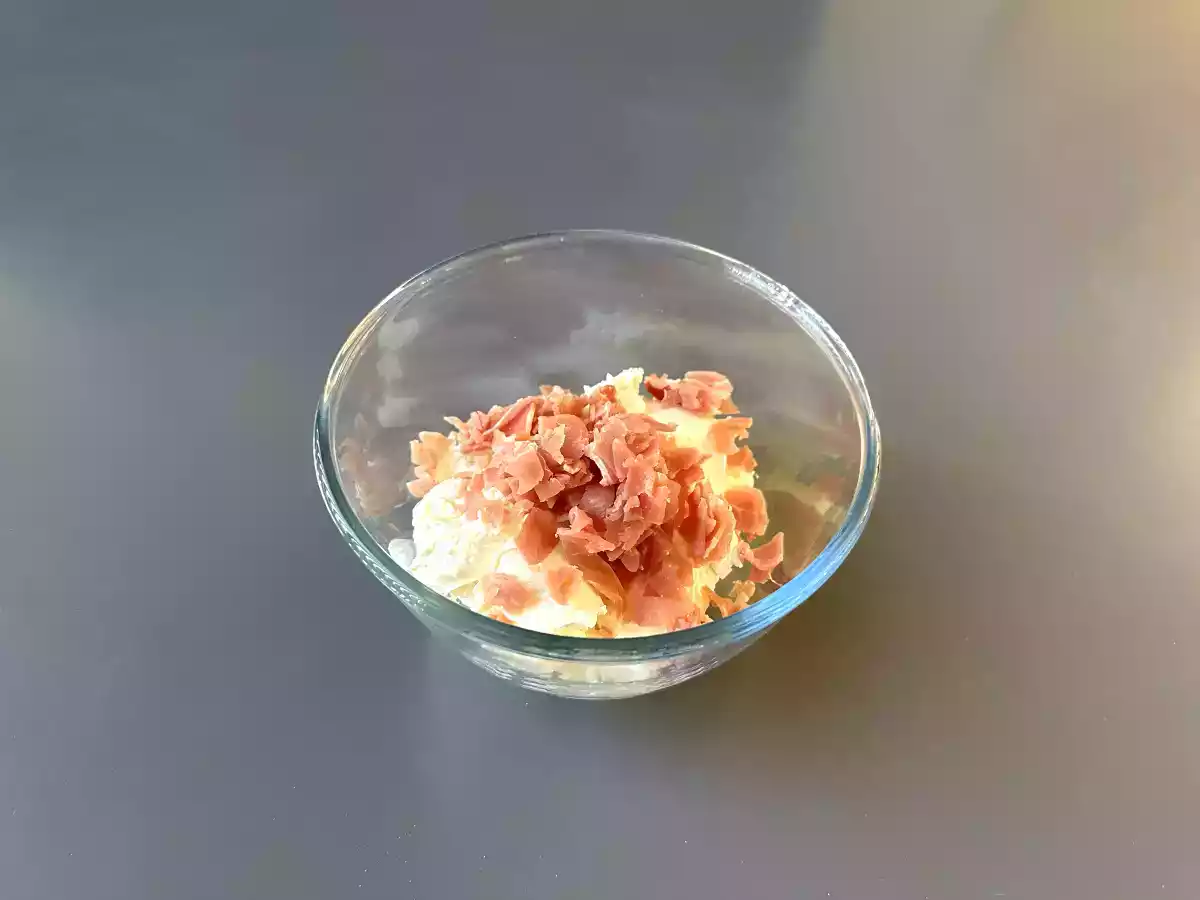 Mettre le fromage frais et le jambon découpé en petits morceaux dans un bol. Mélanger soigneusement