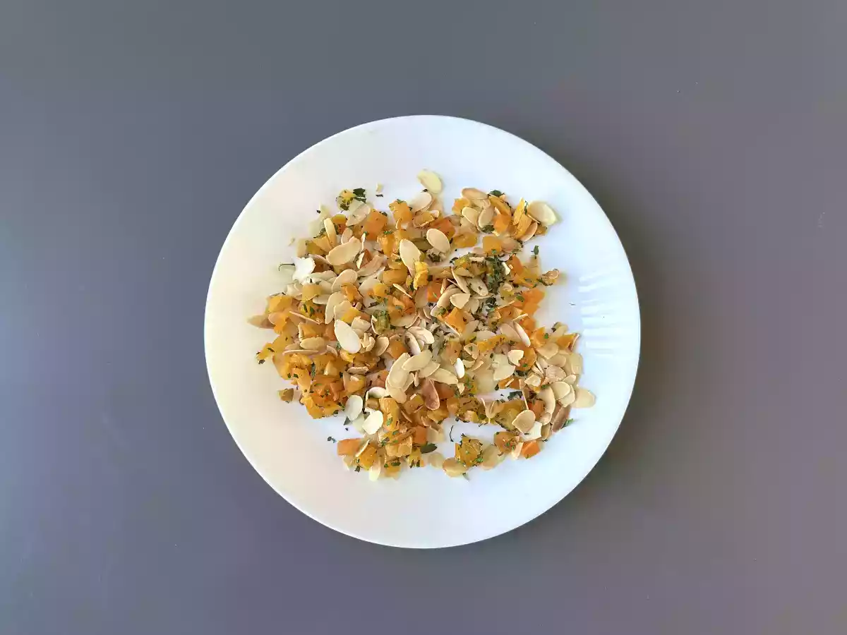 Dans une assiette, mélanger les abricots coupés, les amandes grillées et le persil.