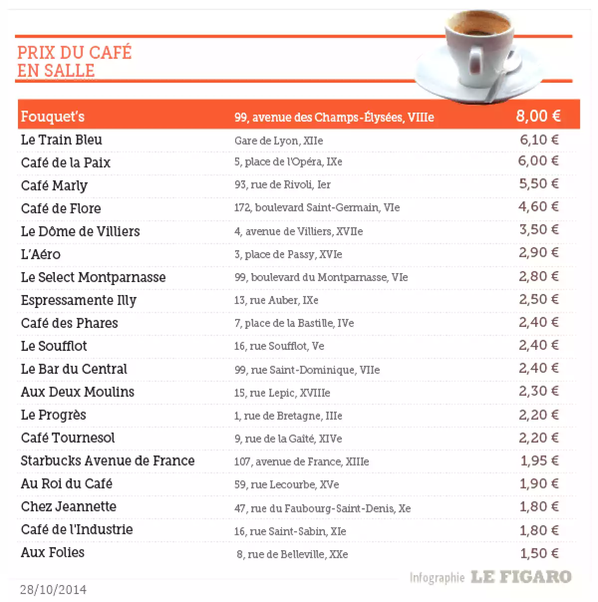 Ainsi, le prix moyen d'un café suivant leur échantillon est de 3,20€. Le café coûtant le plus cher se trouve au "Fouquet's", avenue des Champs-Élysées, et vaut 8€. Au contraire, le plus abordable est à Belleville, dans le 10ème arrondissement, à 1,50€ "Aux Folies".