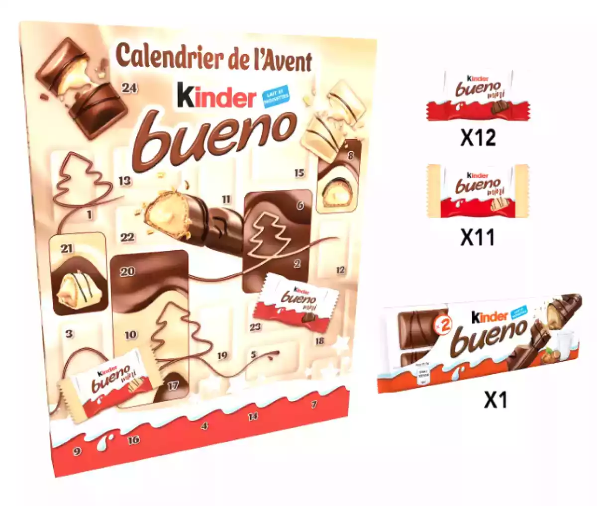 Pour la première fois, Kinder lance son calendrier de l'avent 100% Bueno! Dans cette merveille, vous pourrez donc retrouver des Kinder Bueno mais aussi des Kinder Bueno Mini et des Kinder Bueno Mini White!