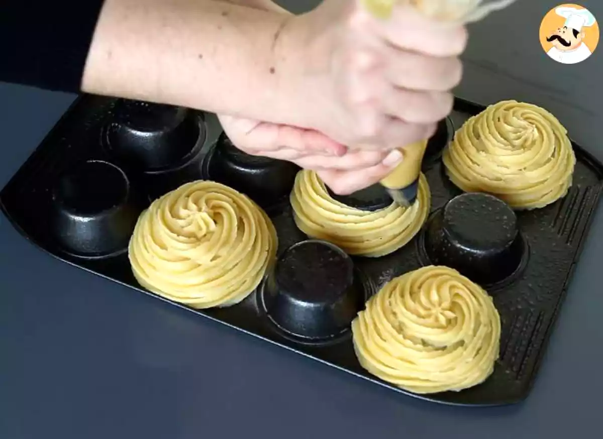 Retournez vos moules à muffins. Ici nous utilisons une plaque mais vous pourrez utiliser des moules individuels que vous placerez sur une plaque de cuisson. Graissez le tout et place au pochage!