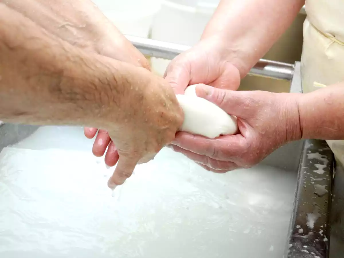 Si vous êtes pressé, vous pouvez réduire la teneur en eau de la mozzarella en la pressant à la main :