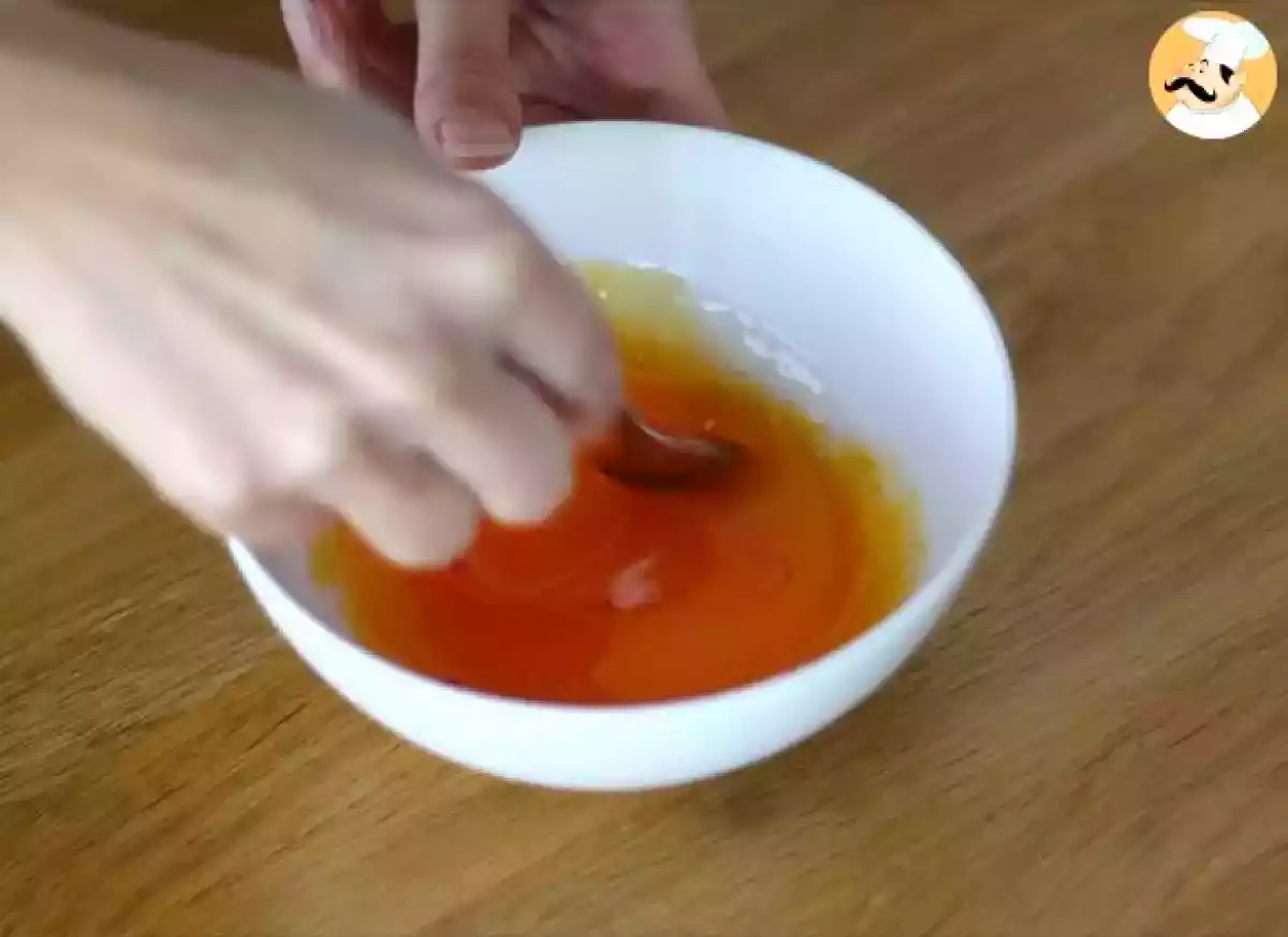 Diviser cette préparation dans deux récipients. Réserver le premier et ajouter le colorant alimentaire jaune dans le deuxième. Mélanger.