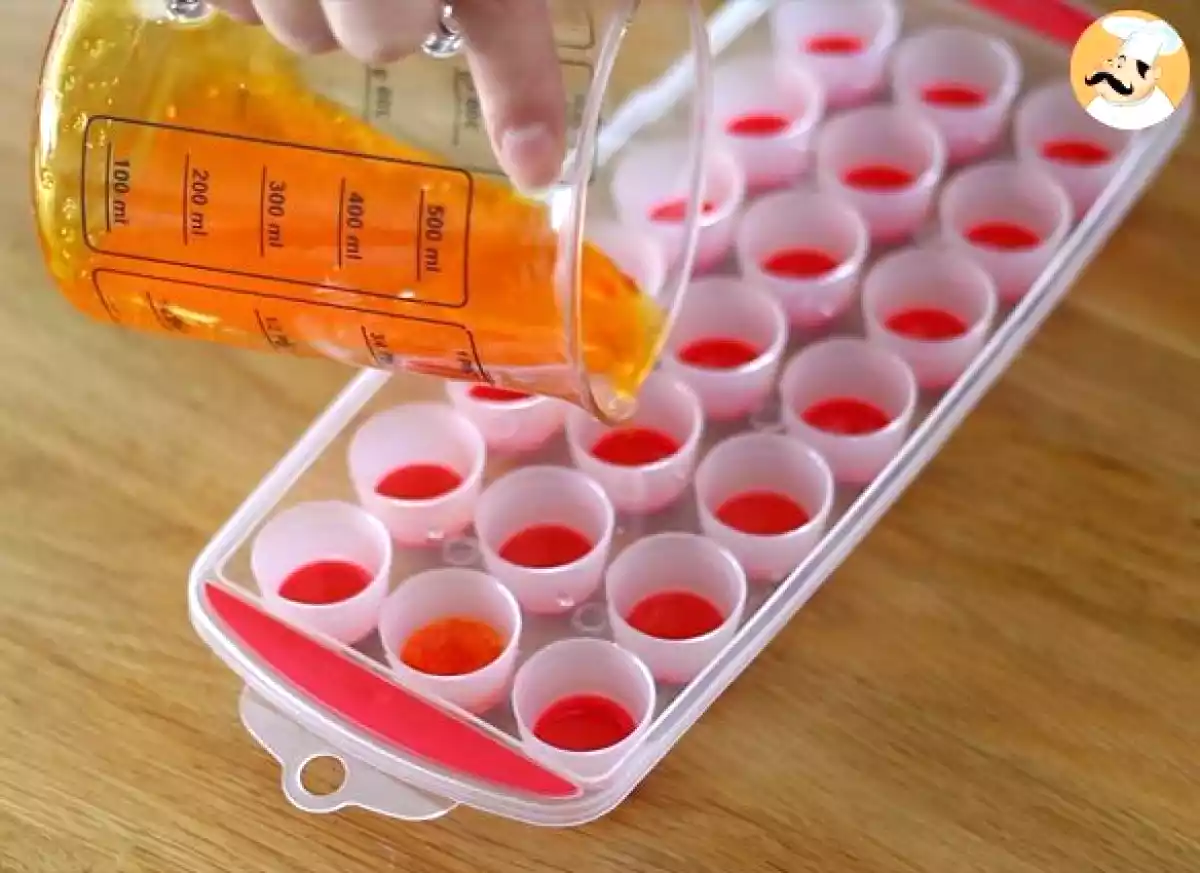 Pour former la partie jaune des bonbons, nous avons utilisé un bac à glaçons avec des empruntes rondes.