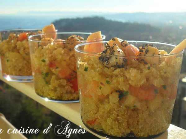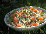 Salade de riz, lentilles, petits pois et saumon au lait de coco