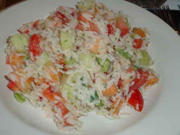 Salade de riz, asperges vertes & tomates jaunes - sauce au boursin moutarde