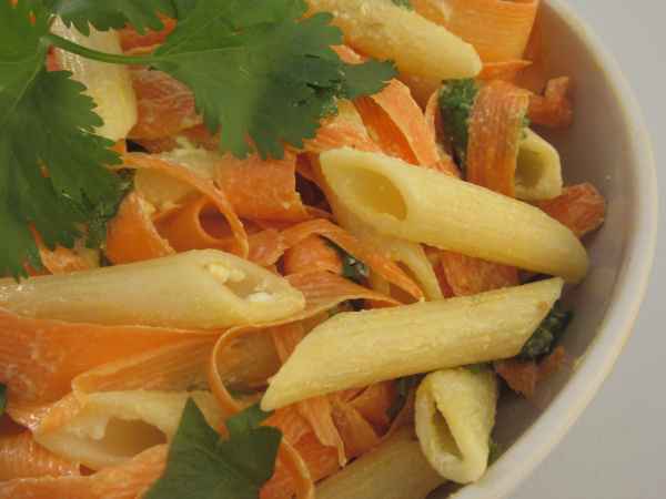 Salade de pâtes, carottes, coriandre et chèvre frais