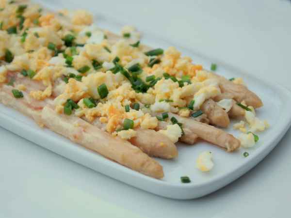 Asperges blanches à la crème, oeuf dur & ciboulette