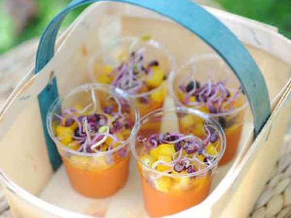 Verrines de gaspacho, tartare de tomate et poivron jaunes