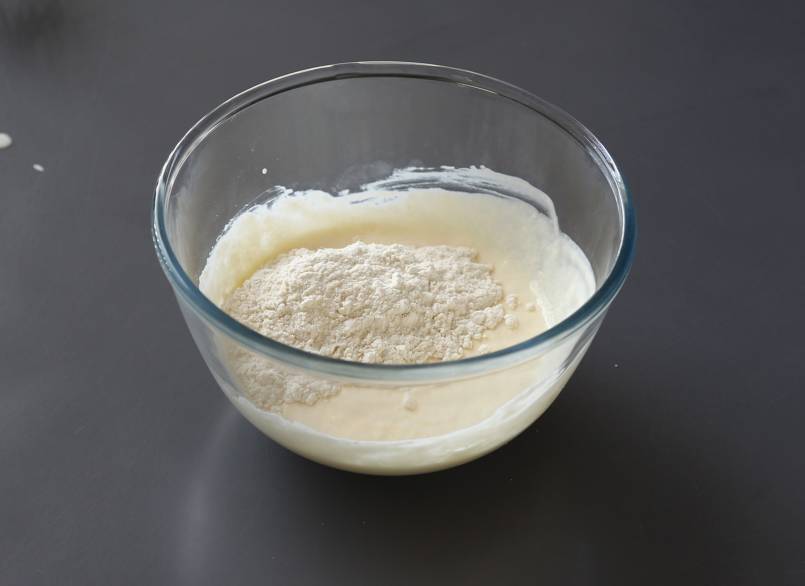Verser le yaourt grec dans un saladier et ajouter l'oeuf. Mélanger le tout. Ajouter ensuite la farine, la levure chimique et la pincée de sel.