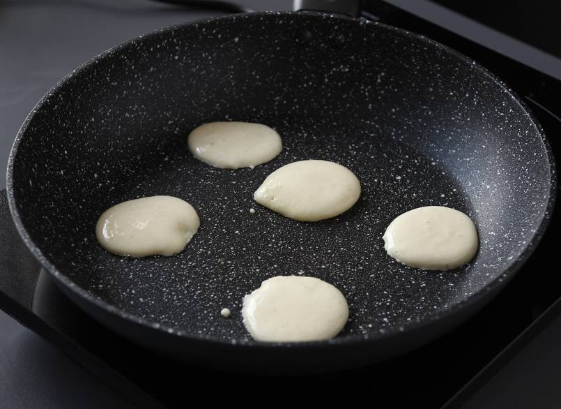 Placer une poêle sur feu moyen et lorsqu'elle est bien chaude, graisser le fond. Former les blinis en déposant environ 1 c. à café de pâte dans la poêle.