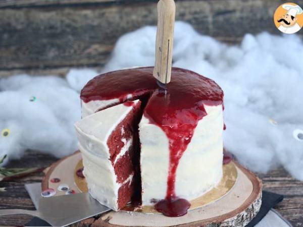 Pour un dessert terriblement gourmand et affreusement trompe-l'oeil, misez sur la déco! Un gâteau rouge, un coulis de framboise et surtout un couteau sauvagement planté au milieu... On vous assure que ce Red Velvet fera son effet ;-)