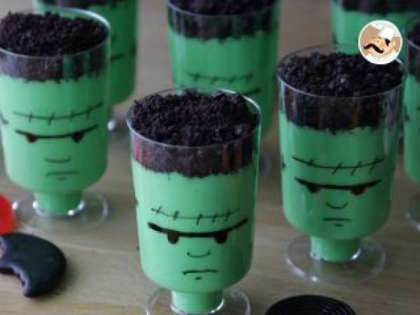Amusez-vous à mettre du colorant dans votre crème et à dessiner sur vos verrines pour un effet Frankenstein monstrueusement irrésistible!