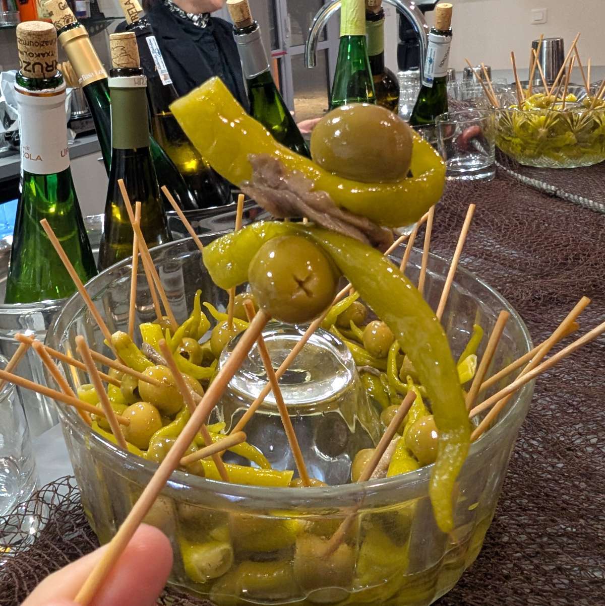 - Gilda: Ce pintxo emblématique marie olives vertes, piments en vinaigre (les fameux piparras) et anchois au sel. Concocté par Elena Navarri, ce classique reflète la simplicité et l’équilibre des saveurs propres à la gastronomie basque.