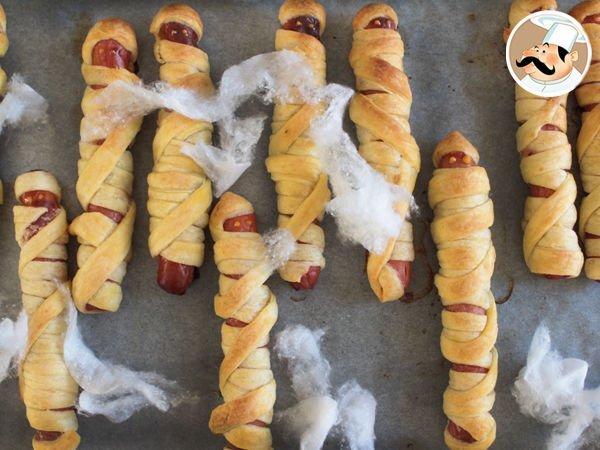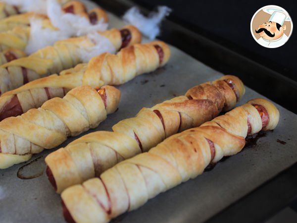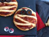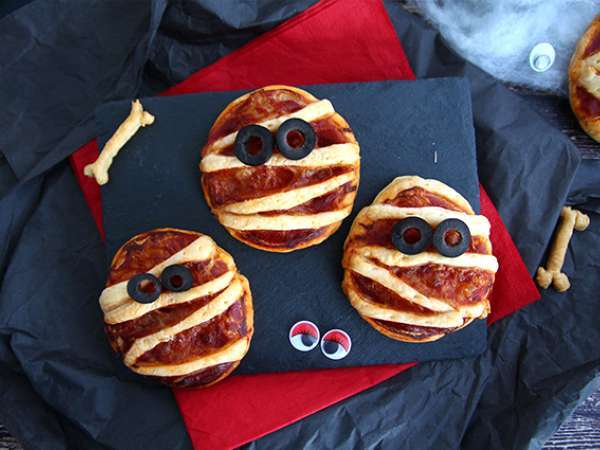 L'avantage avec les pâtes que vous utiliserez et quelles pourront facilement être découpées avec un couteau ou des ciseaux et changer de forme selon vos envies. Prenez l'exemple de nos pizzas momies: en coupant des bandes et en les disposant sur votre garniture, vous pourrez donner cette effet "momie" tant recherché. Utilisez aussi ces bandes pour enrouler vos saucisses knackis et donner le même effet mais avec des ingrédients différents! Succès garanti ;-)