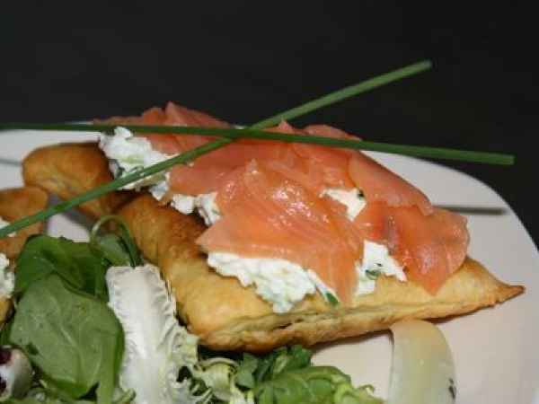 Feuilletés au saumon, pomme verte, concombre & ciboulette