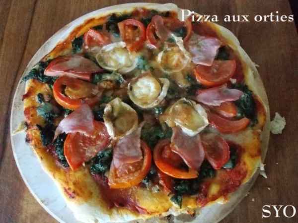 Pizza aux orties, tomate, bacon et chèvre, cuite sur pierre