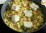 Couper le fromage frais en morceaux et le mélanger au risotto de coquillettes.