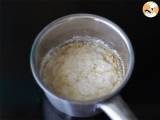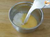 Dans un bol, mélanger 200ml de lait de coco, 200ml de lait concentré sucré, 4 œufs et 50gr de noix de coco râpée.